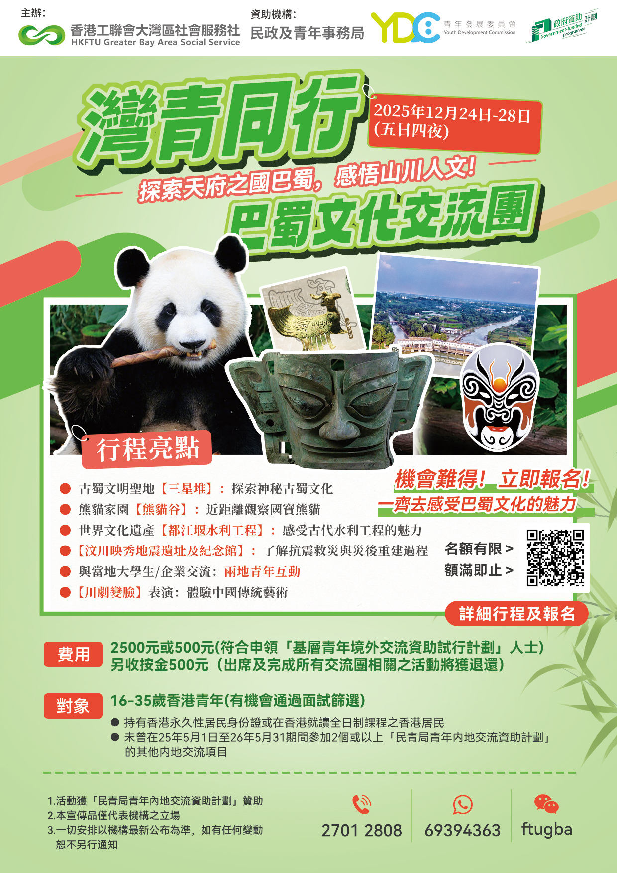 | 灣青同行-巴蜀文化交流團 | 香港工聯會大灣區社會服務社 | 2025年12月24日-28日 | 四川 | 16-35歲的香港居民 | 港幣2,500# | 名額有限,額滿即止 | 網上報名 |