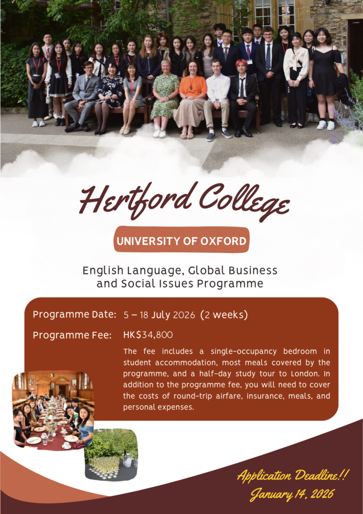 | Programme Fee | HK$34,800 The fee includes a single-occupancy bedroom in student accommodation, most meals covered by the programme, and a half-day study tour to London. In addition to the programme fee, you will need to cover the costs of round-trip airfare, insurance, meals, and personal expenses. |